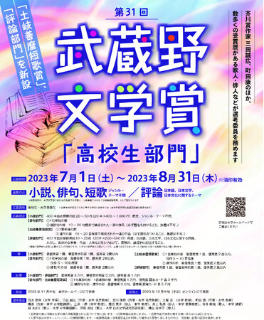 武蔵野大学国文学会(東京都西東京市)は高校生の創作活動の推進および若き才能発掘を目的に「第31回武蔵野文学賞 (高校生部門)」の小説・俳句・短歌・評論作品を2023年7月1日(土)〜8月31日(木)の期間で募集します。