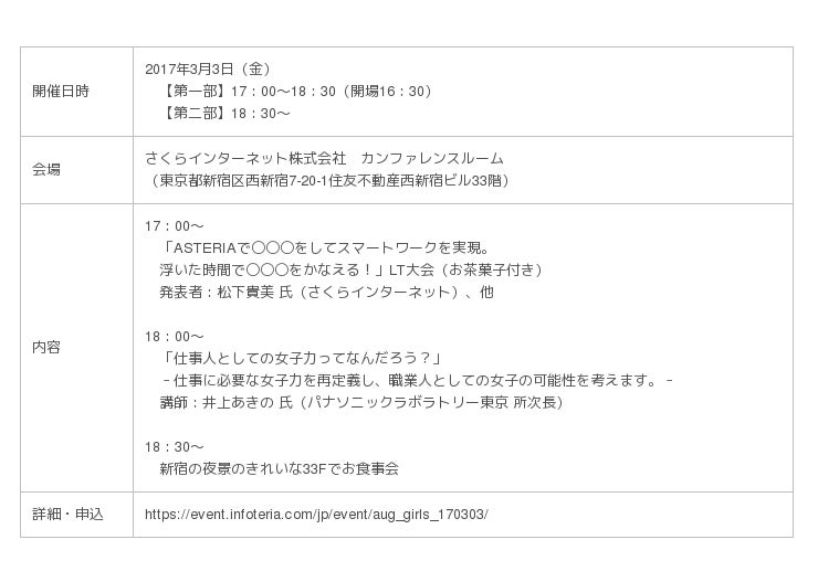 主力製品 ASTERIAのユーザーグループ「AUG女子会」によるイベント第3弾!ASTERIA × 女子 = 女子力アップ、ASTERIAユーザー女性限定 ひなまつり女子会 3/3(金) 開催!