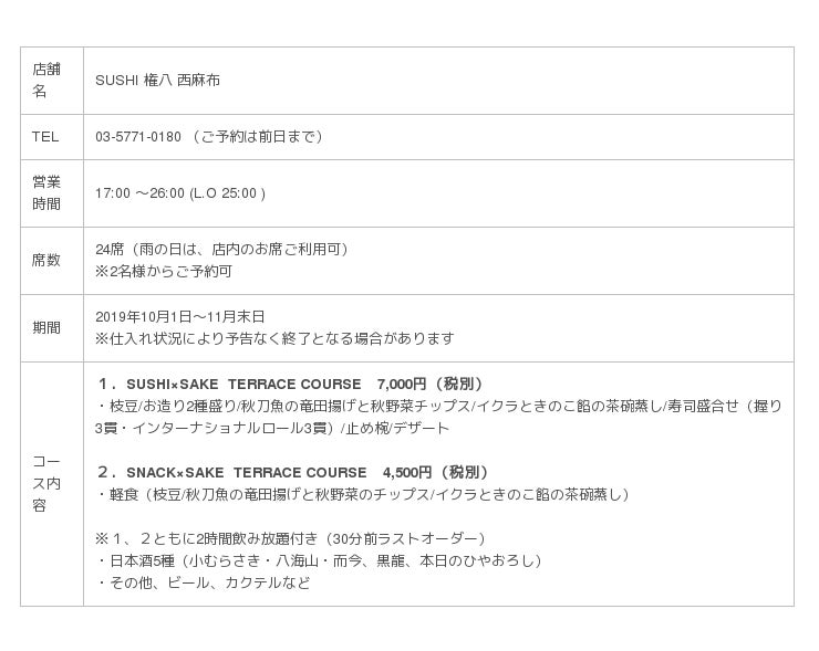 株式会社グローバルダイニングでは、10月1日(火)より、「SUSHI 権八 西麻布」の屋上庭園にて、期間限定コース“SUSHI×SAKE TERRACE COURSE”をスタートいたします。
