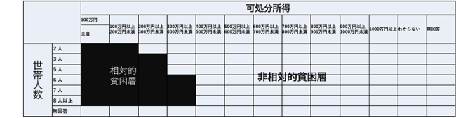 本調査では、「親と子の生活意識に関する調査(内閣府)」における分析方法を参考に、等価可処分所得の中央値の半分(貧困線)に満たない世帯を、相対的貧困層と想定しました。