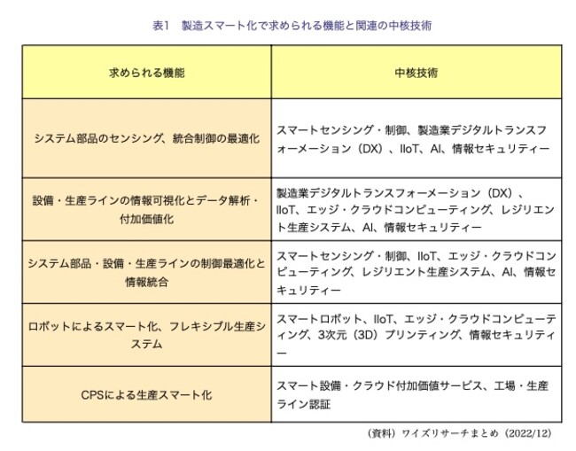製造スマート化で求められる機能と関連の中核技術は以下の表の通りである。
