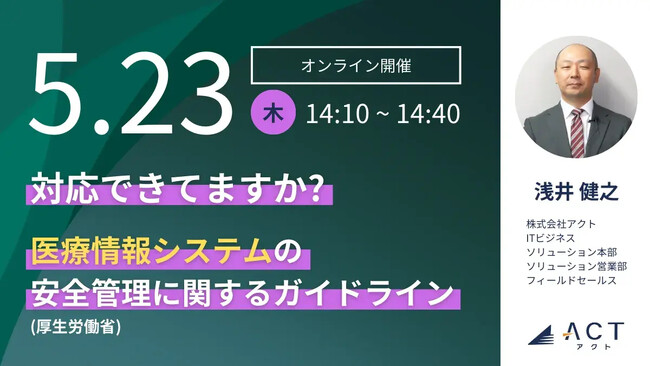 今年30周年を迎え、サイバーセキュリティ事業などを行う株式会社アクト(本社:東京都文京区、代表取締役CEO 小林 智彦 、以下 アクト)は、5/23(木)14時10分からウェビナー【対応できていますか?「医療情報システムの安全管理に関するガイドライン 」(厚生労働省)】を好評につき再開催いたします。