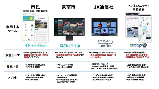 本実証には、JX通信社が提供する、市民参加型ニュースアプリ「NewsDigest」と、あいおいニッセイ同和損保が提供する被害予測・防災アプリ「cmap」を活用します。