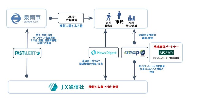 「NewsDigest」と「cmap」を通じて提供された情報は一元的にJX通信社が内容の精査をAIと専門監視スタッフにより行い、泉南市へ同社のAIリスク情報SaaS「FASTALERT」を通じて提供する。