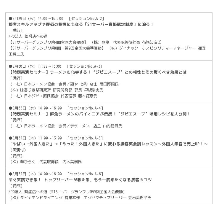 とくに実演も交えた「特別セミナー」は、人気繁盛店のレシピや接客術などを直接学べる貴重な機会です。