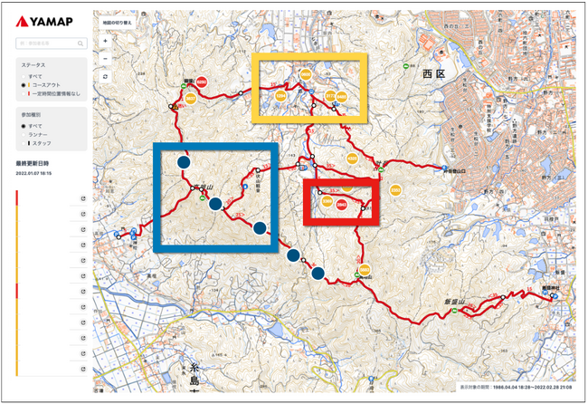 例えば、本システムの中では「登山ルートを外れ、一定時間動いていない人」がひと目で分かります。トラブルで身動きがとれなくなっている可能性が疑われ、近くの隊員が救助に向かうことが可能です。このように隊員の動きを可視化し、隊員の安全を確保することができます。