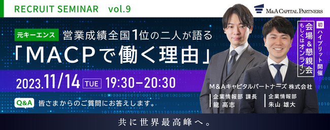 M&Aキャピタルパートナーズ株式会社(東京都中央区・代表取締役社長 中村 悟) は、2023年5月にはじまったMACP"初"の採用セミナー第一弾を皮切りに毎月開催している採用イベントの最新回(11月開催分)の予約受付を開始いたしました。当社主催の採用セミナーとしては初のリアル×オンラインのハイブリット開催となります。