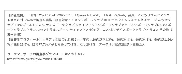 園児とママの情報誌「あんふぁん」「ぎゅって」を発行する株式会社こどもりびんぐ(所在地:東京都千代田区、代表取締役:中島一弘)は、「シルミル研究所」としてリサーチ事業を展開しています。「シルミル研究所」では、女性を対象にした調査「ウーマンリサーチ」を実施し、女性が選ぶおすすめの商品やサービスをランキング形式で、Webコンテンツとして発信しています。今回は2021年12月~2022年1月に実施した「フィットネスクラブ」についての調査結果を発表いたします。
