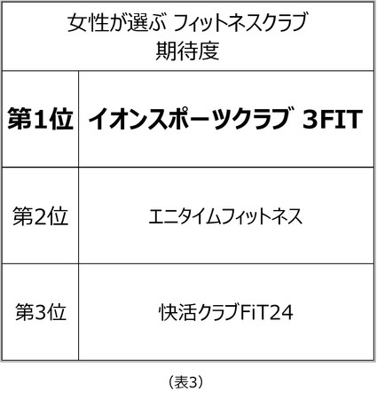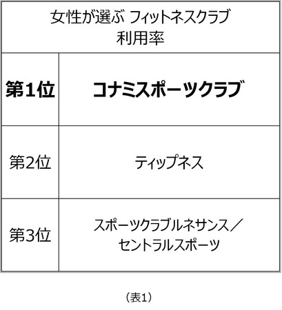 2021年12月~2022年1月に実施した調査において、「コナミスポーツクラブ」が3年連続利用率第1位、「ジョイフィット」が2年連続総合満足度第1位、「イオンスポーツクラブ 3FIT」が期待度第1位となりました(表1〜3)。※期待度=現在の認知者数に対し、「次に利用したい」と回答した人の割合をウーマンリサーチが独自に算出し、今後、さらに利用者数が増加していくことが予想されるフィットネスクラブとしてランキングしています