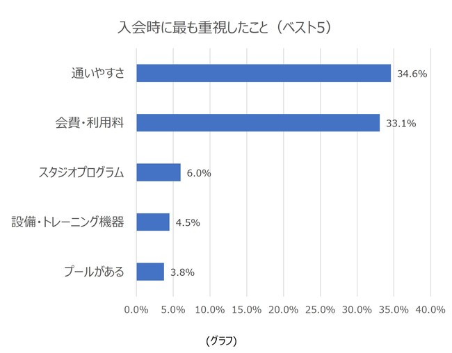 入会の際に最も重視したことは「通いやすさ」が34.6%と最も多く、「会費・利用料」「スタジオプログラム」と続きました(グラフ)。