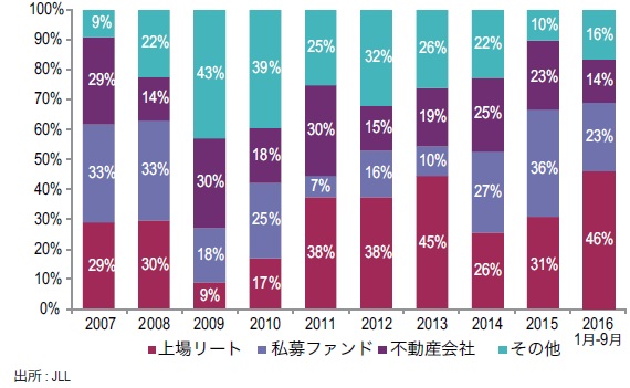 日本の投資額は2015年に前年比で減少し、2016年第3四半期までも前年同期比で減少した。国内外投資家による投資意欲は衰えていないものの、限定的な物件供給を背景に2016年通年の投資額は前年比で減少することが予測され、2016年の日本国内商業用不動産投資額は前年比10%減の3.7兆円程度になるものと予測している。