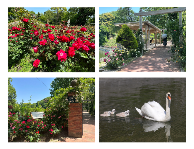 1996(平成8)年開園。1998年には、英国Oxford・Cambridge大学との長年にわたる「日英学術文化交流締結記念庭園」として記念式典を催しました。通年を通して一般公開しており、地元市民や観光客が見学に訪れています。英国からガーデナーを招いて造園した広さ約10万平方メートル のイングリッシュガーデンは国内最大規模。森の自然な形を生かした造りが特徴で、5月はバラ、6月はアジサイ、7月はスイレン・ハナショウブ、8月はハス、秋の紅葉、秋のバラなど四季折々の草花を楽しめます。ガーデン中央に位置する池(約2万平方メートル )は、もとは水田用の貯水池で、雨水を活用した資源循環型システムを導入しています。3段構成になっており、上部のアシやキショウブ、中部のハスやスイレンを経て、浄化された水が下部の池に流れ込む仕組み。鯰や錦鯉、亀、海老が生息。コブハクチョウのつがいが飼育されており、年1回自然産卵しています。