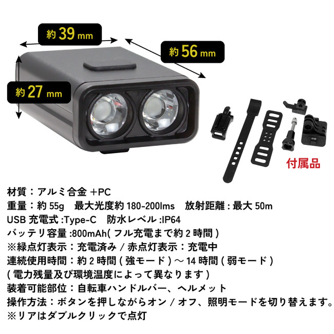 フロントライトとしてまた夜間のヘッドライトとして実用的なサイクルライトです。