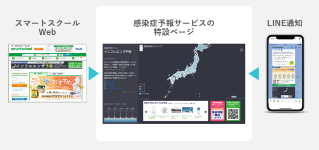 プラス株式会社様が運営する「スマートスクール」は、学校・保育用品や事務用品を中心とした約1,330万点の商品を、注文翌日に全国の学校・保育現場へ配送するサービスです(一部商品・地域を除く)。今回実施したテストマーケティングでは、2021年12月から2022年3月末までの4カ月間、「スマートスクールWeb」内にインフルエンザ予報を行う特設ページを設置し、インフルエンザ流行予報を配信するのと同時に、感染対策におすすめの商品25アイテムを掲載しました。その結果、インフルエンザ予報の特設ページへのアクセスは急増し、掲載していた感染対策商品の売り上げも増加しました。