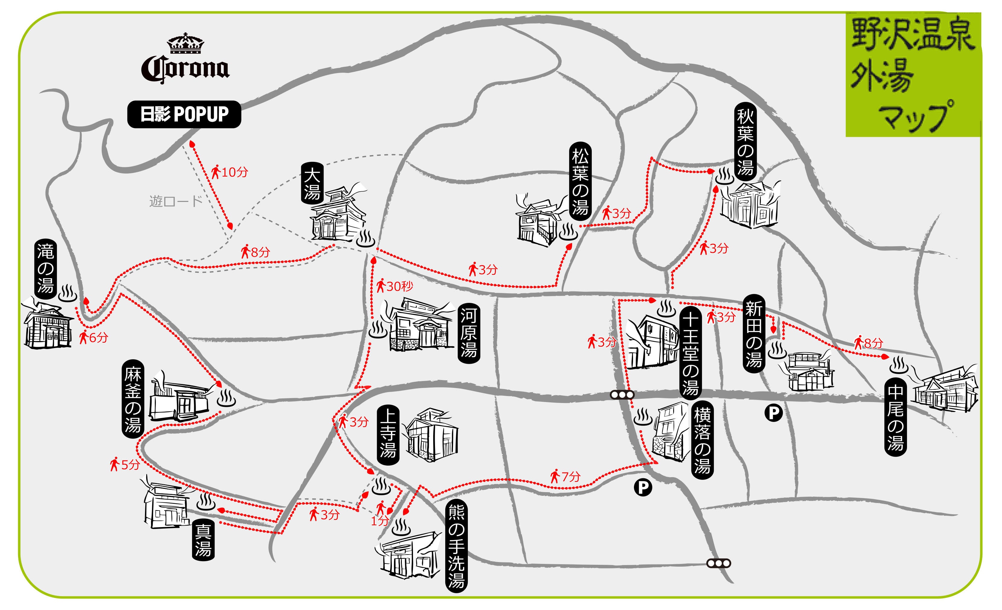 野沢温泉街では、泉質や建物の趣が異なる13ヶ所の外湯の集印所をまわる「集印めぐり」が魅力のひとつです。この冬、「HIKAGE POP UP」が、14ヶ所目のオリジナル集印所となり、合計3カ所、7カ所、14カ所をコンプリートすると、コロナ セロやコロナビールオリジナルの手拭いなどがもらえます。