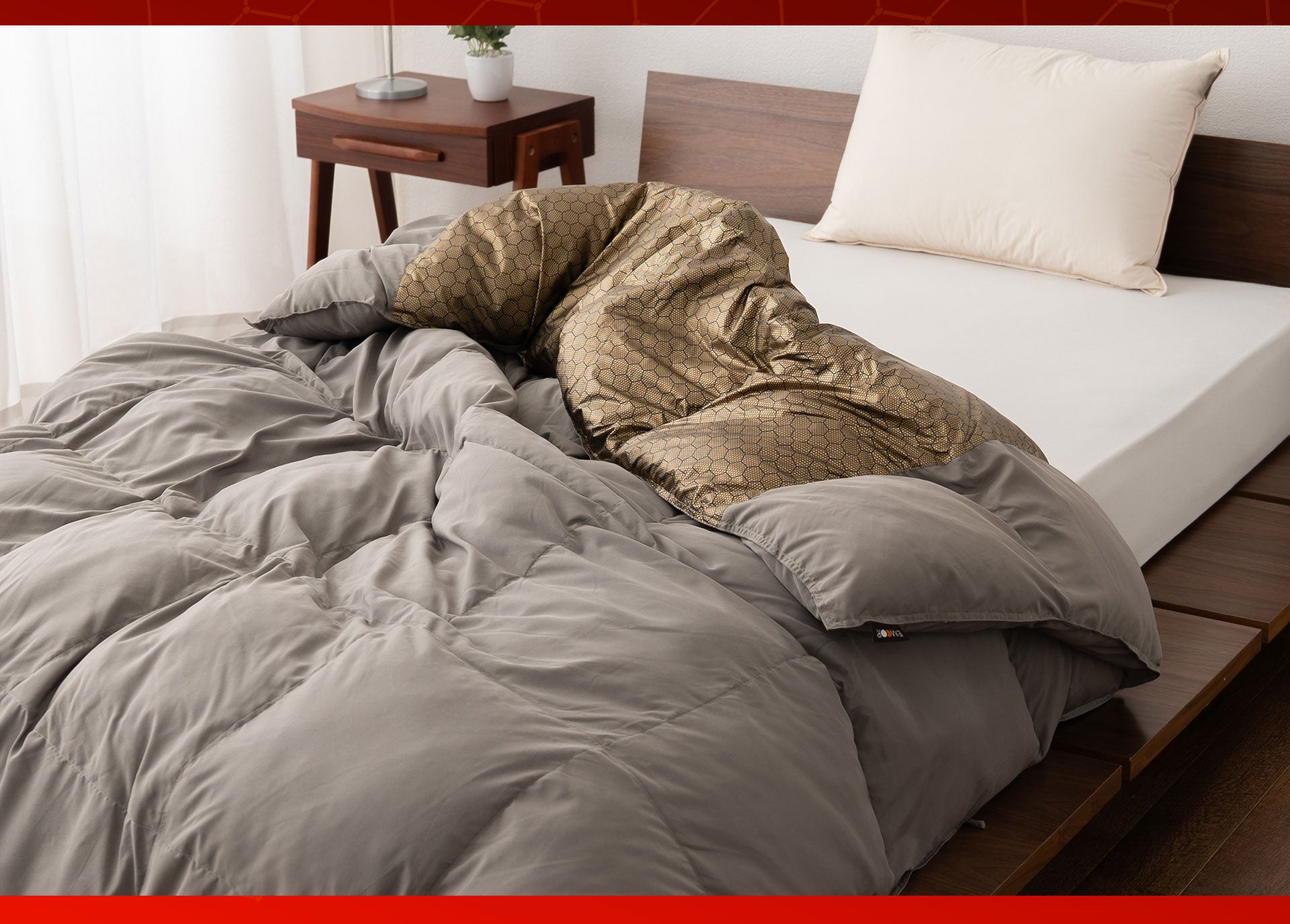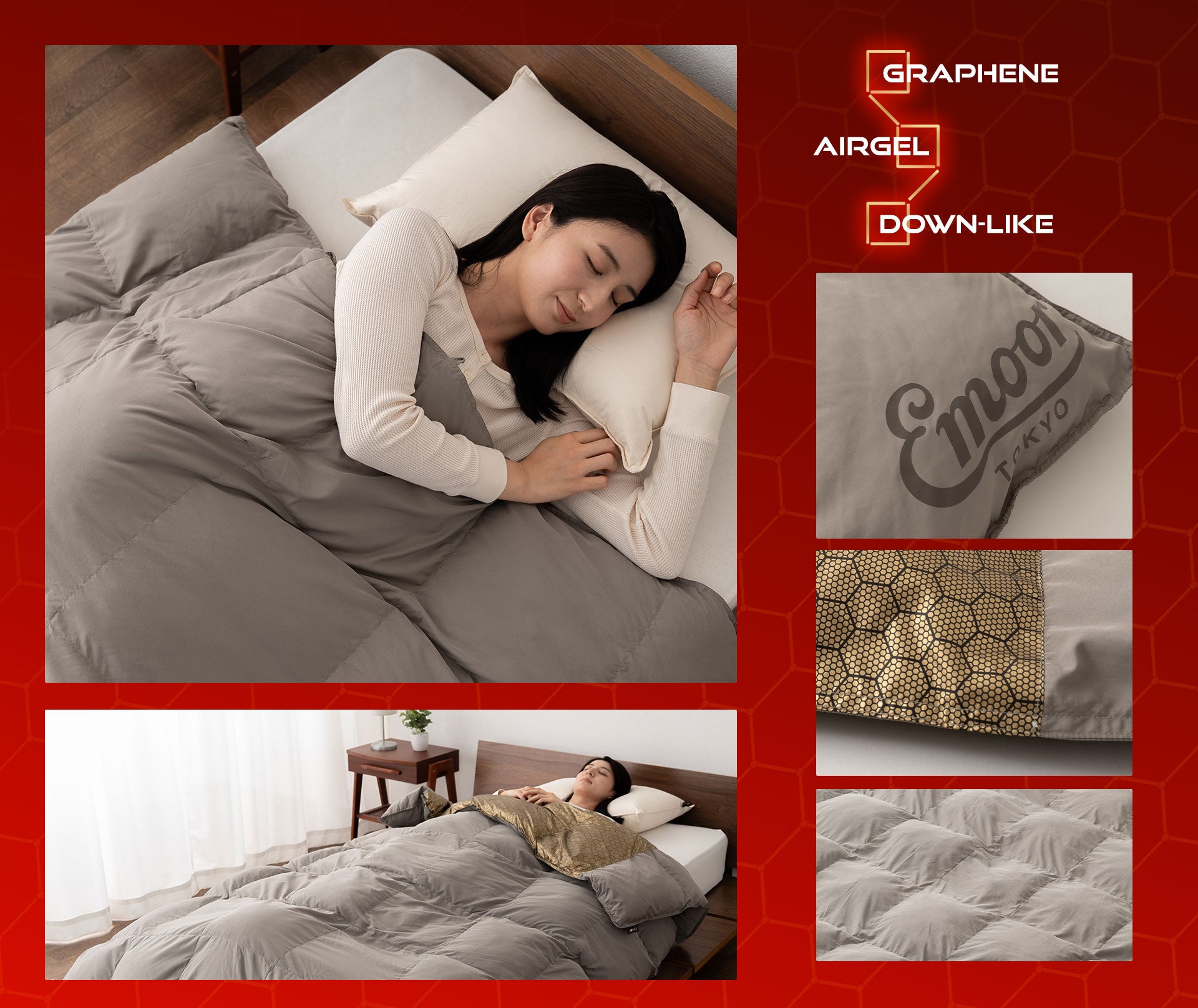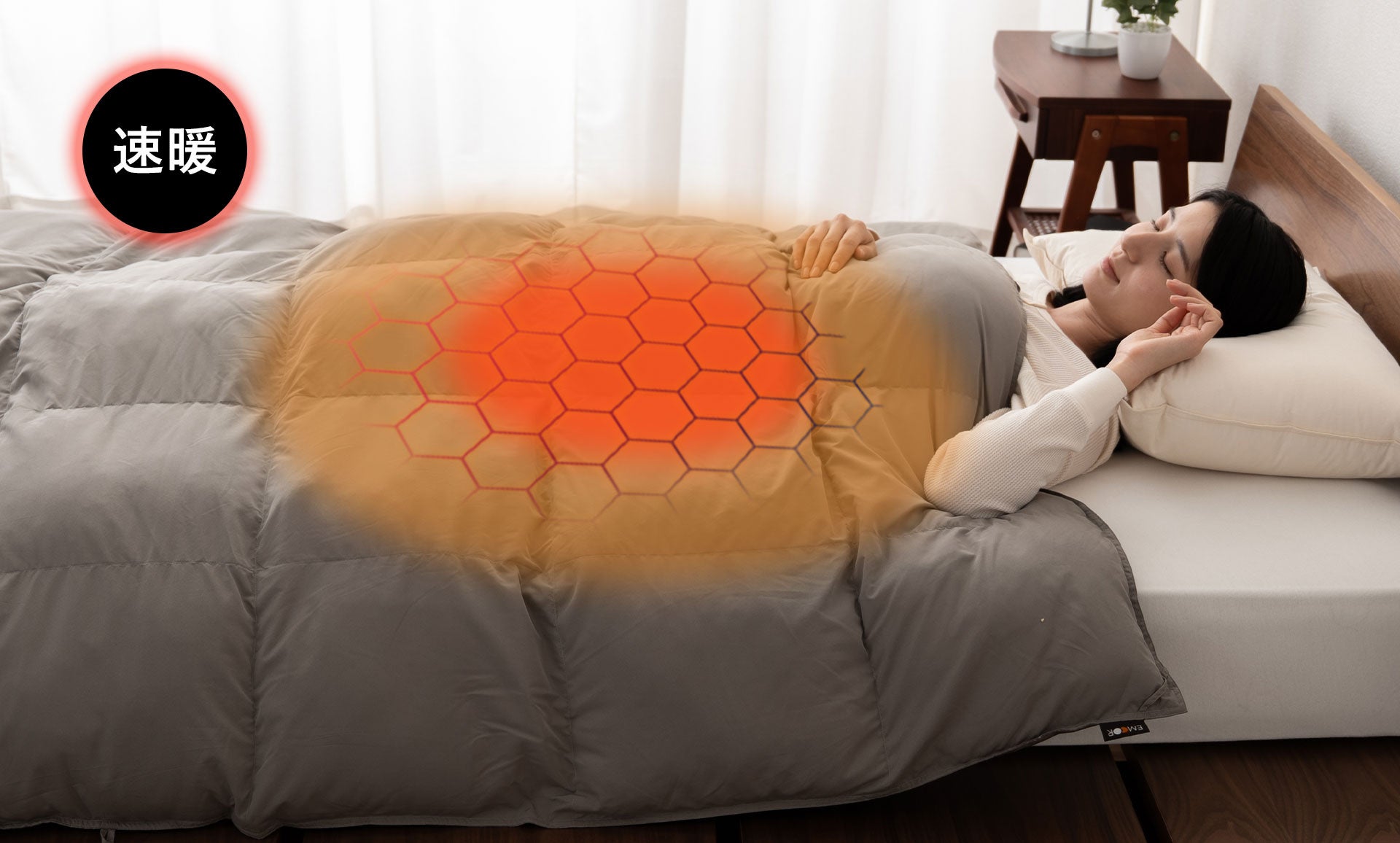 健康家具ブランドEMOOR(エムール)は「グラフェンダウンライク掛け布団」を発売開始しました。グラフェン×エアロゲル×ダウンライクの融合で、エムール史上、最も"暑い"掛け布団が誕生しました。