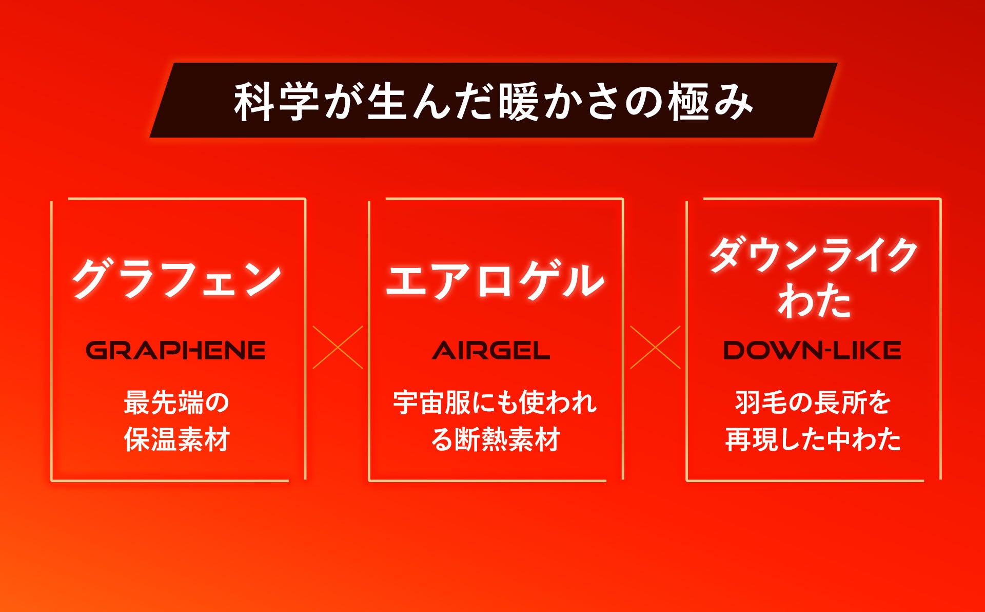 側生地には高熱伝導の遠赤外線素材「グラフェンシート」、中わたには宇宙服にも使われる高断熱素材「エアロゲル」を採用。さらに、羽毛の構造を科学的に再現した“ダウンライク製法”で、軽さと暖かさの理想的バランスを追求しました。