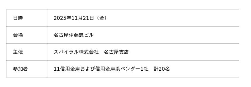 デジタルで未来最適をリードするスパイラル株式会社(東京都港区、代表取締役グループCEO 佐谷 宣昭)の名古屋支店は、2025年11月21日(金)に、名古屋支店が拠点を置く名古屋伊藤忠ビルにて東海エリアを中心とした信用金庫を対象にユーザー会を開催いたしました。