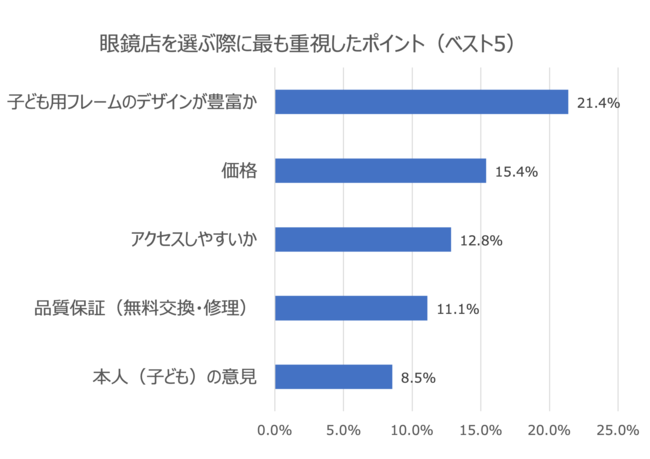 店舗選びで最も重視したポイントは「フレームデザインの豊富さ」がトップに。続いて「価格」「アクセスしやすいか」「品質保証」「子どもの意見」となりました(上記グラフ)。