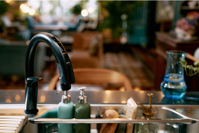 さっとセンサーに手をかざせば水栓に触れずに吐水/止水ができる、キッチン用タッチレス水栓「ナビッシュ」。これまでに累計50万台*以上の販売実績があり、コロナ禍におけるニューノーマルとして“非接触”が定着しつつある中、さらに注目が高まっています。浄水器ビルトイン型やホース引出し機能、お掃除楽々台座のほか、カーブを描いたスタイリッシュなデザインも選ばれる理由の1つ。今回採用されたブラックカラーのナビッシュハンズフリーは、引き締まったクールな印象で、キッチンをより美しく、ワンランクアップして見せてくれます。また、キッチン用タッチレス水栓ナビッシュは水栓だけでの交換も可能でバリエーションも豊富。電源がなくても設置可能な乾電池式タイプは電気工事が不要なのでタッチレス水栓をあきらめていた方にもおすすめです。