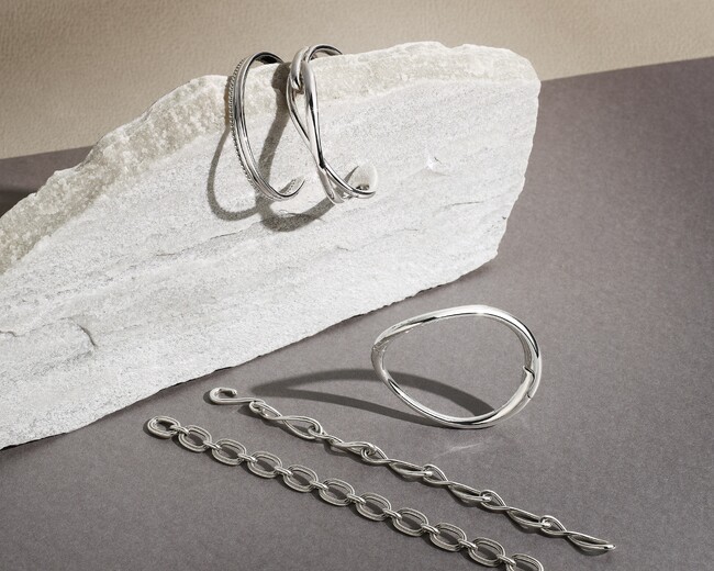 表情豊かな流線型のフォルムが人気のラルゴシリーズからは、8の字が2つ立体的に絡み合った存在感のあるバングルと柔らかな曲線を描いた動きのあるバングルが登場。薄着になる夏の季節に、クールな輝きで手元を彩るアイテムが揃います。