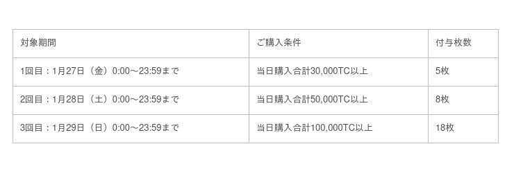 対象期間にTCを購入いただくことで、無料で遊べるサービスチケットをプレゼント。期間中に3回にわたりキャンペーンを実施いたします。