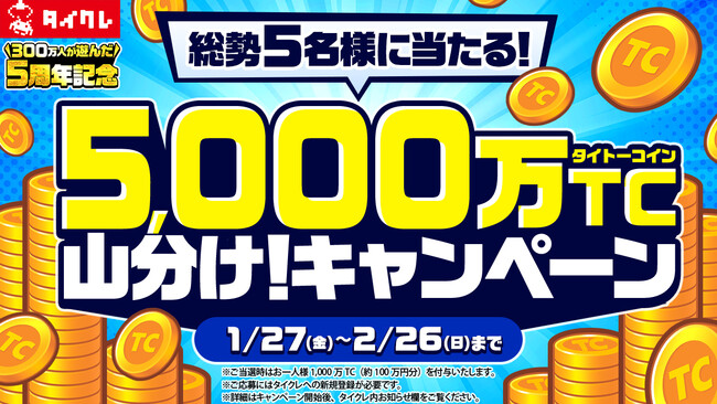 キャンペーンにご応募いただくことで、タイクレで遊べる『5000万TC(タイトーコイン)』(約500万円相当)を総勢5名様に山分けいたします。