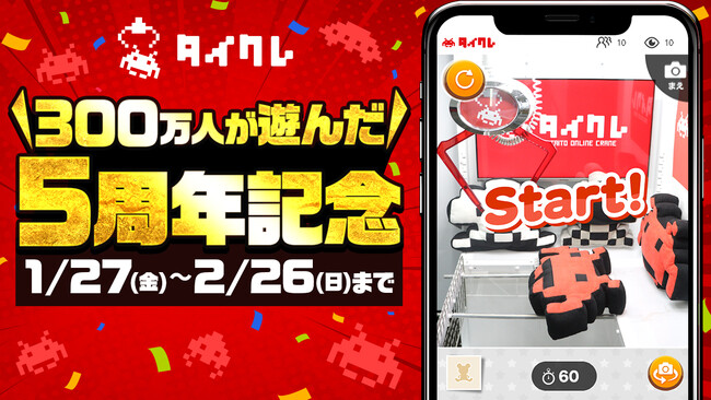 株式会社タイトー(本社:東京都新宿区)が運営する、いつでもどこでもクレーンゲームを楽しめる「タイトーオンラインクレーン(以下タイクレ)」が、登録者数300万人を突破し2月にサービス開始5周年を迎えます。日頃のご愛顧に感謝し『タイクレ5周年記念キャンペーン』を開催いたします!