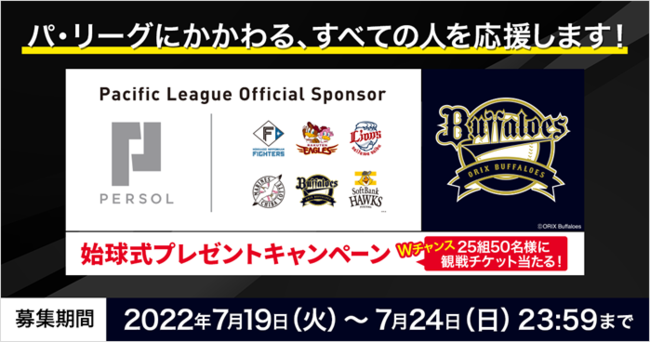 パシフィックリーグマーケティング株式会社(本社:東京都中央区、代表取締役CEO:根岸 友喜)は、2022年度パシフィック・リーグのオフィシャルスポンサーである、総合人材サービスのパーソルホールディングス株式会社(本社:東京都港区、代表取締役社長 CEO:和田 孝雄)とともに、パーソルグループの冠協賛試合「パーソルDAY」の始球式投球権のプレゼントキャンペーンの募集を開始することをご案内いたします。