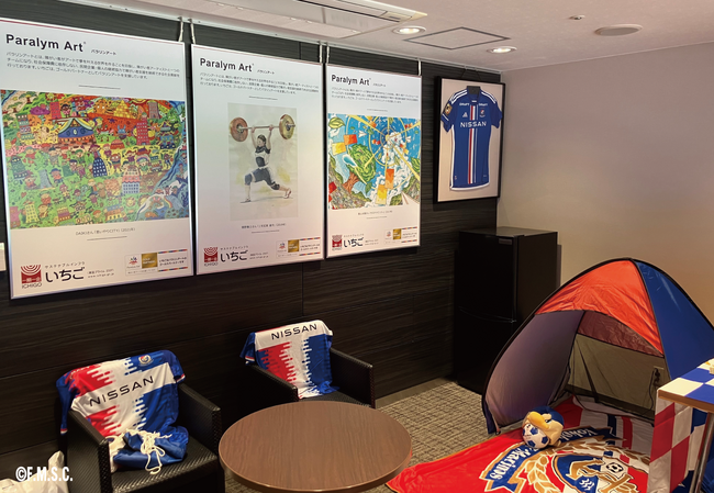 「いちごpresentsフレンドリールーム」では、落ち着いて過ごしていただきながらチームの応援を心から楽しんでいただけるよう、ささやかながら、パラリンアートの絵画や、横浜F・マリノスのキャラクターのぬいぐるみやユニフォームなどで装飾しました。