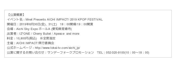 「Mnet Presents AICHI IMPACT! 2019 KPOP FESTIVAL」 は、2019年8月30日(金)にオープンを迎える中部国際空港と直結する新ホール「Aichi Sky Expo」のオープニングイベント「AICHI IMPACT! 2019」の特別ステージです。