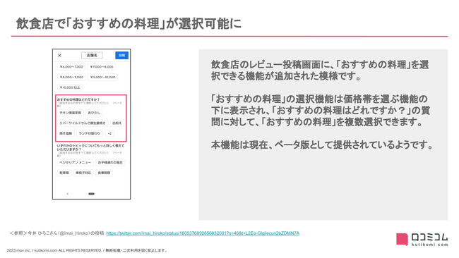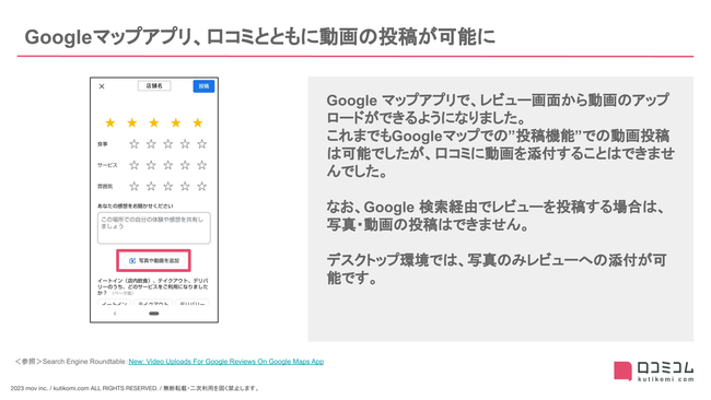 口コミサイトを”もっと”売上に変える店舗支援SaaS「口コミコム」を運営する株式会社mov(代表取締役:渡邊 誠、本社:東京都渋谷区、以下mov)は、Googleマップ・Googleビジネスプロフィール(Googleマイビジネス)の更新情報や、口コミマーケティングノウハウなどの最新ニュースをまとめた「MEO・口コミマーケまとめ【2022年12月版】」を公開しました。