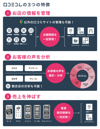 口コミコムは、Googleマップをはじめとした地図アプリや口コミサイトでの店舗情報を整理し一括更新できると同時に、お客様の口コミ分析、クーポンの配信まで行うことで、国内外の口コミサイトを”もっと”売上に変える「口コミサイトの一括管理ツール」です。また、導入頂いた店舗の口コミ数を増やすことにも貢献しておりますので、よりお客様の声を大切にする店舗運営が可能となります。