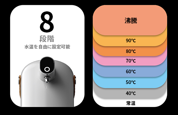 「αikunlun」は常温、40℃、50℃、60℃、70℃、80℃、90℃、沸騰まで合計8段階の水温を自由に設定できますので、粉ミルク、コーヒー、お茶、味噌汁、カップラーメンなどのどんな調理にも便利です!