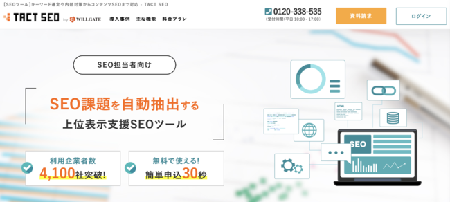 「TACT SEO」はウィルゲートが3,100社以上のSEOコンサルティングの知見をもとに開発した、狙ったキーワードで上位表示するためのSEOツールです。延べ4,100社(2022年7月時点)のSEO対策に取り組む企業様にご利用いただいています。