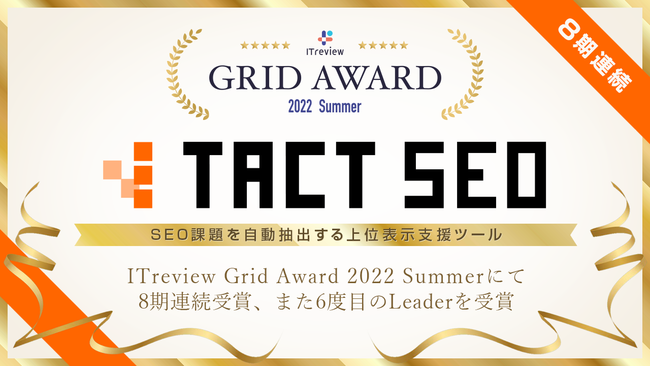 株式会社ウィルゲート(本社:東京都港区、代表取締役:小島 梨揮、以下 ウィルゲート)が提供するSEOツール「TACT SEO」は、アイティクラウド株式会社(本社:東京都港区、代表取締役社長:黒野源太)が主催する「ITreview Grid Award 2022 Summer」の「SEOツール」部門において、認知度とユーザー満足度が優れているサービスに贈られる「Leader」を受賞したことをお知らせいたします。今回でSEOツール部門は8期連続受賞、「Leader」の受賞は6度目となります。