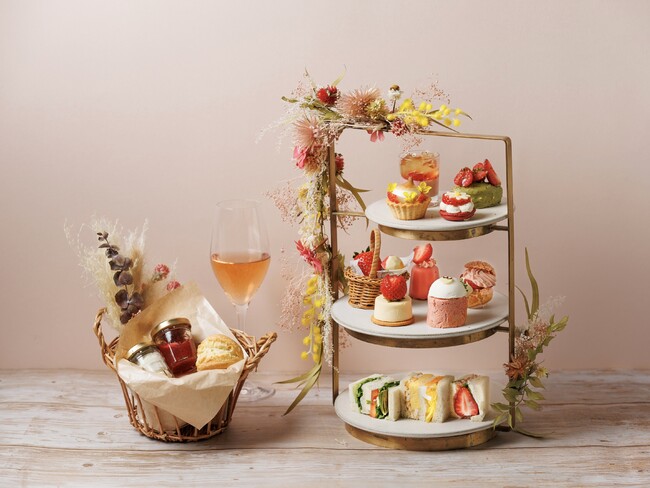 滑らかな口あたりの「有機苺と練乳のロールケーキ」をはじめ、「チーズケーキと有機苺」や「有機苺とライチのムース」、サクッとした食感のシュー生地にヘーゼルナッツプラリネと有機苺クリームをたっぷりと絞った「有機苺とヘーゼルナッツプラリネのシュー」を中段にご用意。ひと口サイズのサンドイッチが並ぶ下段には「有機苺と生ハムのサンドイッチ」、「平飼い卵と人参のサンドイッチ」、「無農薬野菜のサンドイッチ」の3種類がラインナップし、自家製スコーン」は別皿でご提供いたします。「有機苺の自家製コンフィチュール」や「クロテッドクリーム」と一緒にお召し上がりください。