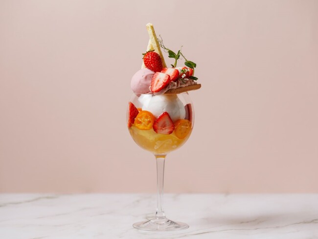 また、合わせて販売開始する季節限定のパフェ、「有機苺と金柑のパフェ」は有機苺と相性の良い柑橘系で日向夏のコンフィチュールや金柑のコンポート、金柑の香り漂う白ワインのジュレを使用し、フロマージュブランや有機苺の自家製のアイスを合わせました。味のアクセントにココナッツライチアイスを加え、有機苺タルトもトッピングした見た目も楽しめる一品に。