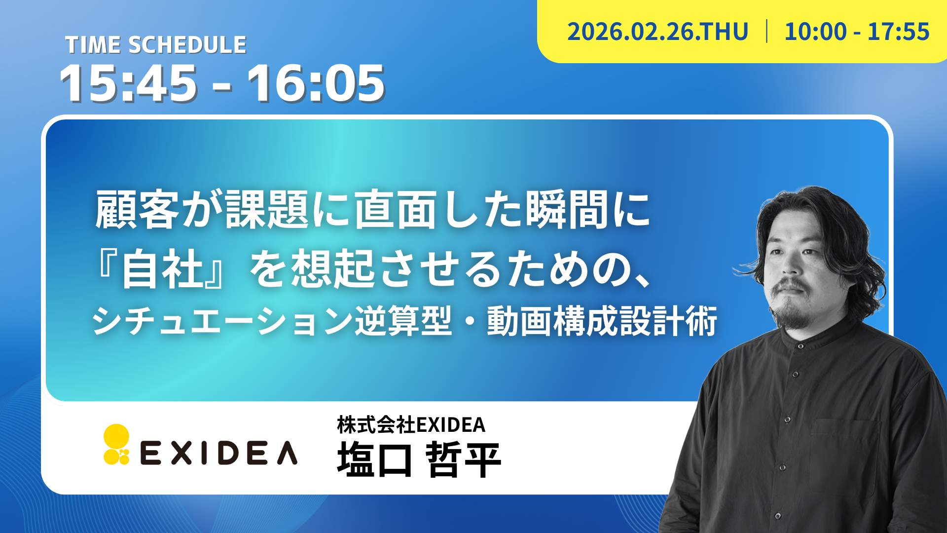 市場の”第一想起”を実現するカテゴリーブランディングを提供する 株式会社EXIDEA(本社:東京都中央区、代表取締役:小川 卓真)は、2026年2月26日(木)に開催される、BtoBマーケティングの最新手法を網羅するオンラインイベント「成果に直結するBtoBマーケティング施策 比較19選」(主催:株式会社マーケティングコミット、株式会社フラグアウト ehaco!運営事務局)に登壇することをお知らせいたします。