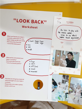 3.最後に、ママ・パパが「気づきタワー」に掲示された気づきを参考に、わが子が好奇心を発揮した瞬間を振り返ります。身体のどの部分を使っていたか?好奇心を引き出したポイントは何か?今日一番気に入ったアイテムは何か?を振り返り、「きょうの好奇心カード」を完成させていただきます。