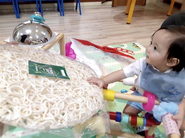 2.いろいろな素材、日用品、おもちゃなど、赤ちゃんの好奇心を引き出すアイテムで自由に遊んでいただきます。研究員は、赤ちゃんが遊んでいる様子を観察。好奇心に関する気づきを、写真と一緒に、「気づきタワー」に貯めていきます。