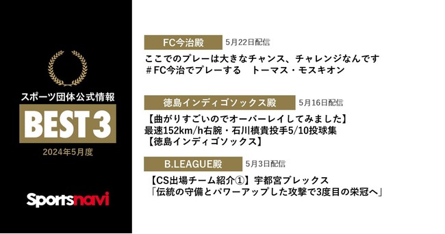 スポーツナビでは毎月、公式情報記事・動画配信において最も印象的だった記事・動画3つを選定し、「スポーツ団体公式記事・動画 月間ベスト3」と称して表彰させていただいております。