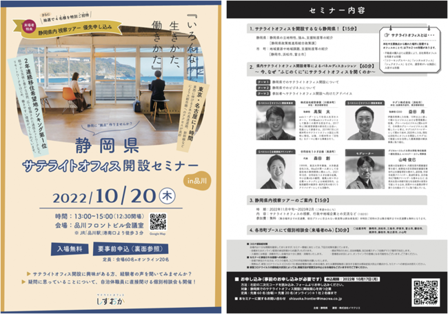 セミナーは静岡県にサテライトオフィスを開設した企業の皆様によるパネルディスカッションや、県内各市町によるPRブースの出展、自治体担当者との個別相談会など盛りだくさんの内容です。