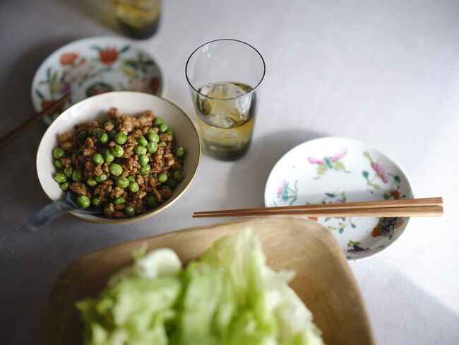 ・春(春にんじんのスープ、新ごぼうの塩きんぴら、グリーンピースと挽肉の炒めレタス包み、牛肉とセリのサラダ、豚肉と春キャベツの黒胡椒炒め、鶏肉とアスパラガスのオイスター炒めなど)