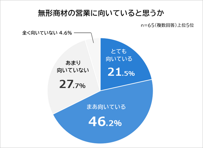 無形商材の営業にやりがいを感じ、「向いている」「楽しい」と感じている人が多いとわかります。
