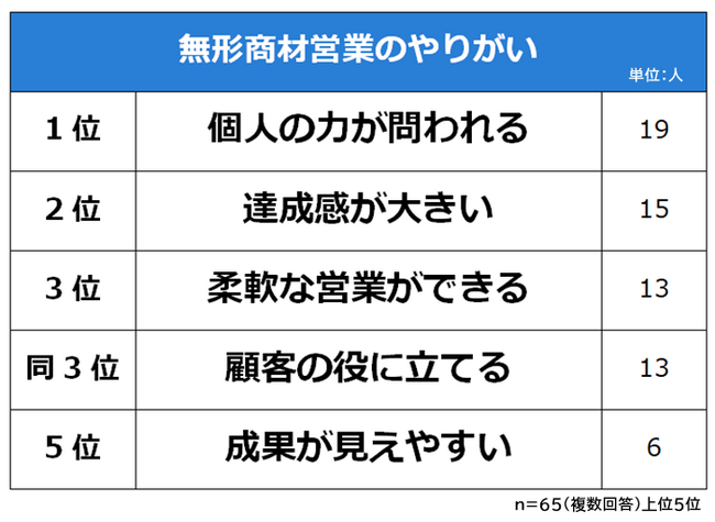 無形商材の営業をしたことがある65人にやりがいを聞いたところ、1位は「個人の力が問われる(19人)」でした。以降、2位「達成感が大きい(15人)」、同率3位「柔軟な営業ができる(13人)」「顧客の役に立てる(13人)」、5位「成果が見えやすい(6人)」の結果となりました。