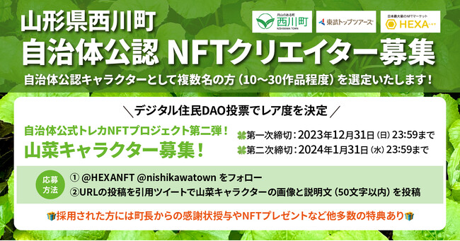 自治体公式NFTトレカプロジェクト第二弾「西川町山菜トレカNFT」の公認NFTクリエイター募集について、約1万名のNFTクリエイターが登録するNFTマーケットのHEXA(ヘキサ)と、西川町の地方創生事業を協働する東武トップツアーズ株式会社が企画の全面協力を行います。