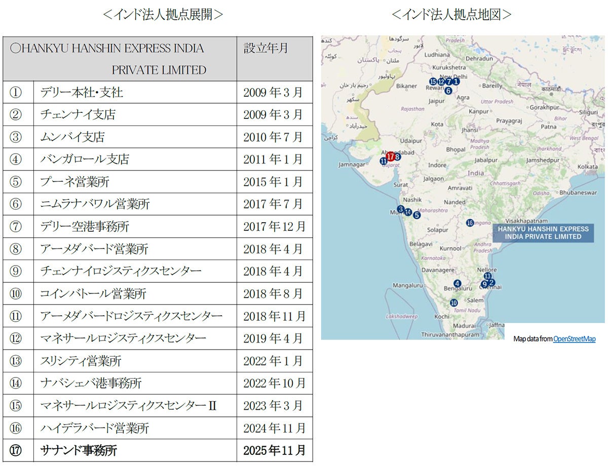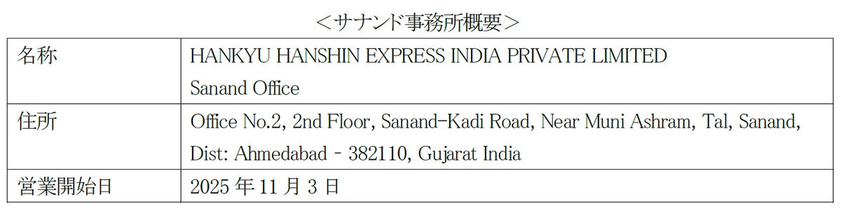 阪急阪神エクスプレス(本社:大阪市北区 代表取締役社長:谷村 和宏)のインド法人である HANKYU HANSHIN EXPRESS INDIA PRIVATE LIMITED(本社:デリー)は、インド西部のアーメダバード市近郊のサナンドに新たに事務所を開設し、11月3日より業務を開始します。