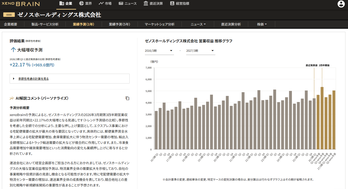 株式会社xenodata lab.(本社:東京都台東区、代表取締役:関 洋二郎)は、経済予測プラットフォーム『xenoBrain』において、上場企業の1年先までの業績予測データに「パーソナライズAI解説コメント」機能を追加しました。