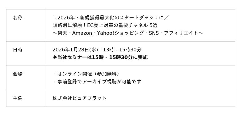 EC市場が生活インフラとして定着し、新規顧客の獲得単価の高騰や競合ブランドとの差異化が非常に難しくなっている現状を踏まえ、EC売上対策の重要チャネル5つ(楽天・Amazon・Yahoo!ショッピング・SNS・アフィリエイト)に焦点を当てた共催ウェビナーです。